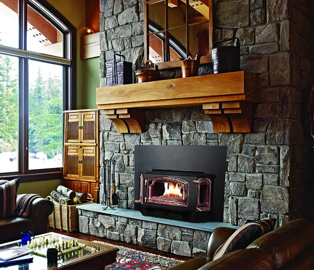 A true three window bay view allows for wide angle view of the fire. A thermostat controlled dual fan circulates room air for maximum efficiency. This is your big house wood heater!